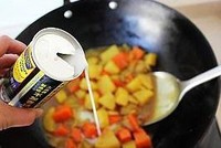 等到土豆和胡萝卜炖软、汤汁变少,加入少许海鲜酱油,加入半罐椰奶
