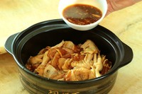 将腌制好的鸡块挑出放入铺好厚生姜片的砂锅中,腌制的腌料倒出备用。