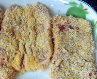 最后看起来像这样子~然后就可以放到锅里去炸啦.我没有拍过程因为我没有用锅炸~我发现空气炸机更好用!用锅炸,尽量让油漫过猪排,油热的时候下去,然后用中火炸8-10分钟就可以捞起来啦