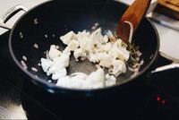 在平底锅中将上述三种食材用黄油小火炒制,同时加入百里香及月桂叶,将一半(40克)的培根切碎放入锅中一同炒制,然后加入水(没过食材即可)、盐、胡椒,小火煮制直到所有食材变软烂。