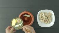 铺上鸡块 把鸡块铺在汽锅中 PS:水蒸气从汽锅底部的空冲入汽锅,自然冷凝成为汤汁,所以汽锅中一点水都不要放