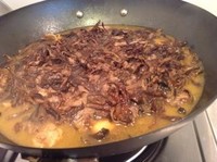 这时锅里散发出鸡肉的香味儿,加入蘑菇。