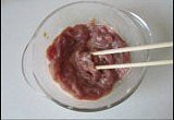 在肉丝中加入盐, 生粉, 胡椒, 料酒等调味料