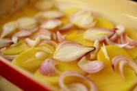 马铃薯去皮切片,洋葱切片,烤盘底面刷半勺橄榄油,均匀铺上土豆片和洋葱。