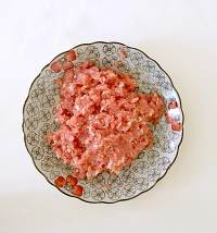 第一步:瘦肉自己慢慢剁,不要用外面的绞肉器(卫生,有肉香味),加点淀粉,增加肉嫩感。