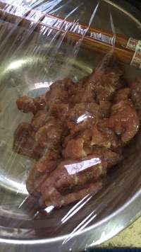 切好瘦肉,切薄片,加生粉,盐和酱油腌制半个小时