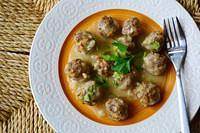 肉丸从烤箱中取出,浇上汤汁,撒上干酪和适量洋香菜,开始吃