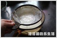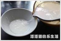 把蛋清奶液缓缓沿着刚才划破的奶皮缺口倒会碗里,让奶皮浮在上面