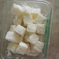 待凉后,放入冰箱冷藏一夜,脱模、切块,滚上椰丝,即可食用!