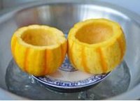 将金瓜的肉用小勺子取出,只留下部分南瓜肉