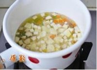 接着加入适量水,煮开后放入豆腐丁,调入一勺生抽