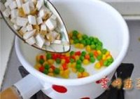 搪瓷汤锅中放入油,将玉米,青豆,胡罗卜,杏鲍菇先炒熟