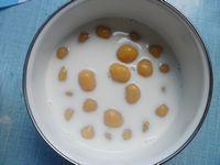 等南瓜小圆子熟了浮起来后捞出,放在装有牛奶的碗里