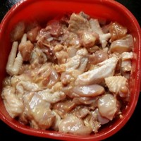 土鸡砍块,依次调入姜泥、盐、酱油、少许白糖、一滴白酒或一匙料 酒、花生油、生粉腌制。