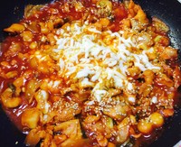 此时锅中会有汤汁,加入年糕继续翻炒,如果汤汁太少可加入适量清水但不易过多,待年糕变软糯后将菜铺匀撒入白芝麻,转小火撒入马苏里拉芝士,芝士变软后关火~
