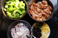 鸡腿去骨,切块,加盐、白糖、生抽,抓匀。苦瓜去蒂,洗净,切片。洋葱洗净,切块。