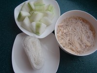 冬瓜切滚刀块,金针菇洗净后放碗里,加入开水烫熟捞出,粉丝用水冲一下。