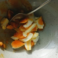 芝麻叶剪掉五厘米根部,泡水清洗。煮一颗鸡蛋,煮到喜欢的熟度,五分钟溏心,八分钟凝固,十分钟全熟,捞起冲冷水剥壳,用勺子捣碎。