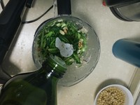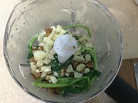 捞出芝麻菜后控干,直接加入搅拌机,同时添加核桃、大蒜、芝麻和盐、黑胡椒碎、奶酪粉