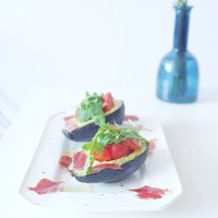 将切好的樱桃番茄填入牛油果中,撒上橄榄油,柠檬汁,然后铺上西班牙火腿以及芝麻菜。
