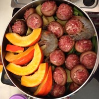 5•7升多用锅。放150克的白糖 化成糖色!放入五花肉上色 再放入 生抽 老抽 蒸鱼豉油 花椒大料水 翻匀后关火!翻炒放旁边 另一面放入事先味好的偏口鱼(生抽 少许糖 料酒 姜末 葱段 醋 腌制好 一个小时!)鱼上面放芸豆 然后土豆 青虾 香菇盅(猪肉馅 调成爱吃的饺子馅 依个人口味、我喜欢放白胡椒粉 跟鲍鱼汁)最上面放切好的南瓜