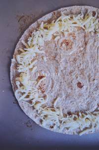 全麦薄饼上薄刷一层橄榄油; 用马苏里拉芝士在薄饼边缘围一圈(外围预留一点空位,如图)