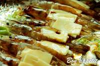 葱切成段,铺满锡纸,放入烤盘,把虾整齐的排列在葱段上。*当然是芝士面朝上*
