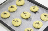用手取一小团红薯泥揉圆压扁,放在铺吸油纸的烤盘上。表面刷一层油上面撒一点黑芝麻。