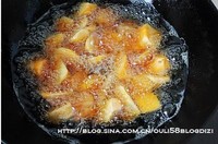 下锅炸红薯,中火慢慢炸,务必将红薯炸得外脆里嫩才行