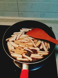 豆干煸炒2分钟,表面微黄后加入芦蒿,继续煸炒2分钟