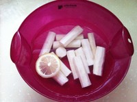 将山药去皮,切成等长的小段,泡在滴了白醋的水里,防止山药在空气中氧化变黑,放一片柠檬也有同样效果哦