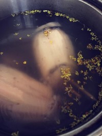 放水里煮开后换小火煮半小时,再放冰糖,桂花小火煮一小时。