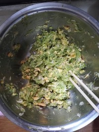 西葫芦丝擦好后,放一点点盐,把西葫芦里的水控出。控出后用手捏干西葫芦,如下图。