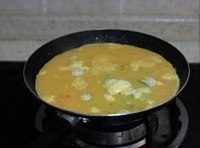 关小火,倒入鸡蛋液,喜欢鸡蛋煎好一些的,就用筷子搅动一下,让更多的鸡蛋液流到锅底,如果喜欢嫩的,就不用动它
