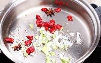 锅内倒入油,五成热后放葱姜、大料煸炒出香味,再放入辣椒,出香味也不容易糊