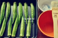 把秋葵放在烤盘上,准备好食用油和细盐,毛刷备用。