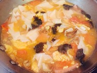 将番茄鸡蛋木耳松茸一起炒,加水,熬煮开,小火10分钟,加入面皮