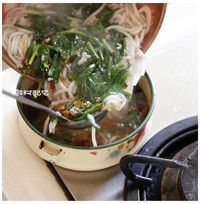 锅内根据个人喜好放入酸菜,剁椒酱,韭菜段,豌豆尖,大火煮沸后搅拌均匀。