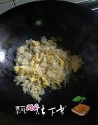 油锅热后,先将鸡蛋炒鼓大泡盛出,再将银耳倒入翻炒,有高汤加一大勺最好,加盐略闷一下,一下下就好,久了银耳就不脆了