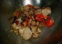 加入草菇、红椒块中火快速翻炒
