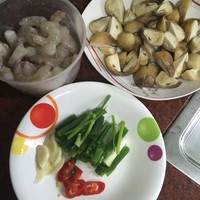 草菇洗净切块,准备蒜瓣、红辣椒、葱段。