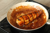 锅内少许油,放鸡肉卷煎一下,然后擦去多余的油