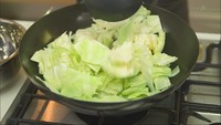 放入蒜碎和盐,蒜焦黄后放入卷心菜,在撒上黑胡椒。