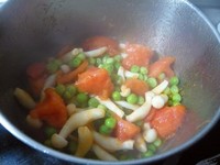 汤锅里加一调羹油,油温8成热了把西红柿倒入锅里炒2—3分钟,然后甜青豆和白玉菇放到汤锅里,加适量的汤水,加盐,烧开后加鸡精,然后左手拿放鸡蛋的碗将鸡 蛋慢慢倒入锅里,右手拿勺子按一个方向搅动,直到鸡蛋全部倒入锅里,洒入一点白胡椒 粉,不要让汤翻滚,鸡蛋浮起来了,就关火,这样汤里的鸡蛋看起来好看。