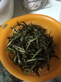 新鲜的蕨菜撕成两半,用水泡一晚,中间记得勤换水,可以去掉涩味。