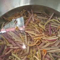 将买回来的蕨菜每根剖成两瓣,切段用开水煮一下,备用