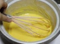 开始打蛋黄,把蛋黄打散,加入糖,搅打至糖融化,加入牛奶和油, 搅拌均匀