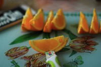 先把一个橙子切八到九瓣。大橙子切九瓣,小橙子切八瓣。怎么切?先把橙子对半切,再把两个对半切的再对半切……把把它们对半切。就是先1/2,再1/4,再1/8……