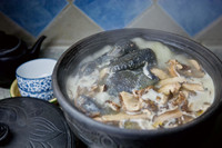 将清水发涨的松茸片捞起置入汤中。余下的松茸浸泡液静置2分钟后,将澄清部分也注入锅中。熬炖45分钟即可,最后根据个人口味加入少许盐。