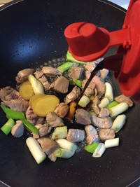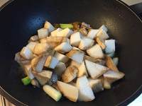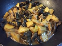 这时加入泡蘑菇的水,一定用上面一层,地下的渣滓不要一起到倒进锅里,手法一定要轻